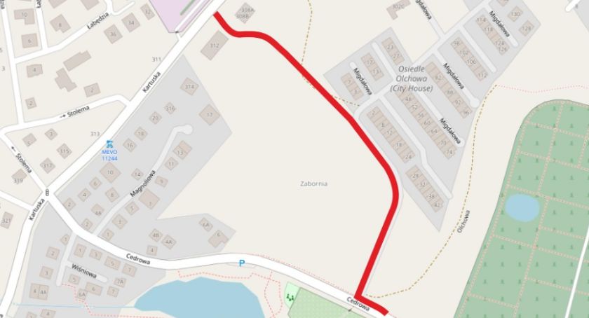 Nowa droga, zwana roboczo Nową Olchową, będzie rozpoczynać się na wysokości posesji nr 312 i 308B przy ul. Kartuskiej. Dalej będzie przebiegać wzdłuż budynków położonych przy ul. Migdałowej i połączy się z ul. Cedrową śladem ul. Migdałowej.