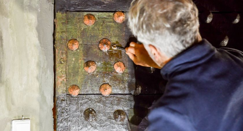 – Oglądając deski pod lupą, znalazłam resztki zielonej i czerwonej farby. Pobrane próbki zostały wysłane do laboratorium. Jednak potwierdzenie i weryfikacja tamtych badań mogła nastąpić dopiero w trakcie kompleksowej konserwacji i usunięciu wtórnych warstw farby – mówi dr Katarzyna Darecka. – Prace konserwatorskie wykonuje dyplomowany i doświadczony konserwator dzieł sztuki Michał Masorz. Podczas prowadzonych już prac ustalił, że powierzchnia drzwi pierwotnie pomalowana była na kolor zielony o malachitowym odcieniu, natomiast łebki gwoździ na czerwono - dodaje.