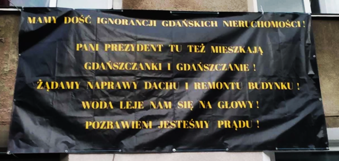 - Mamy dość ignorancji Gdańskich Nieruchomości. Pani prezydent tu też mieszkają gdańszczanki i gdańszczanie! Żądamy naprawy dachu i remontu budynku. Woda leje nam się na głowy. Pozbawieni jesteśmy prądu – czytamy na wiszącym na kamienicy transparencie.