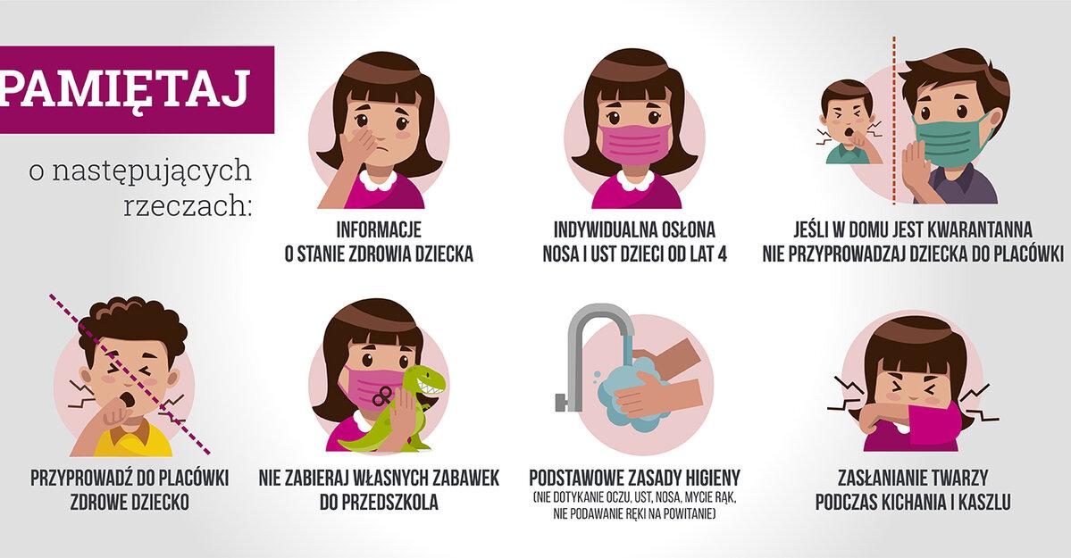 Rodzice, którzy zadeklarowali wolę oddania dziecka pod opiekę placówek powinni pamiętać o podstawowych zasadach higieny i bezpieczeństwa. Do przedszkoli i żłobków mogą przychodzić jedynie dzieci zdrowe. W placówce należy też przekazać wszelkie informacje o stanie zdrowia malucha. Jeśli dziecko ma jakiekolwiek objawy infekcji powinno pozostać w domu. Kwarantanna w rodzinie jest bezwzględnym powodem do pozostania w domu.