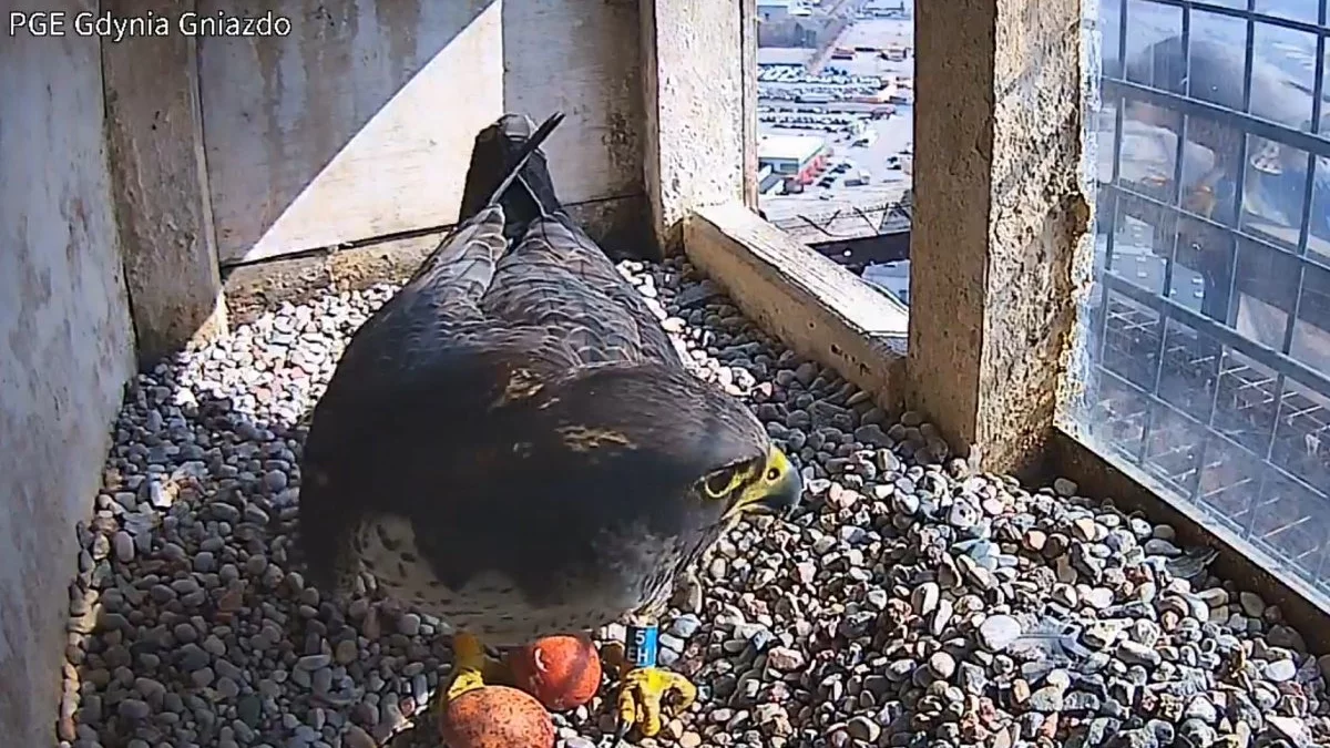 Sokoły wędrowne Gdynia 2026. Dwa jaja w gnieździe Sary i Stera