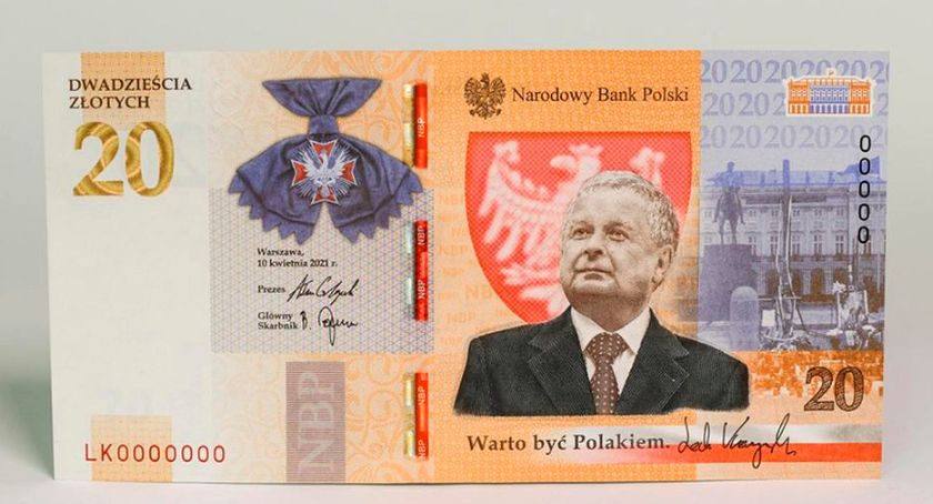 Seria 80 tysięcy sztuk 20-złotowego banknotu z wizerunkiem prezydenta Lecha Kaczyńskiego trafi do obiegu w najbliższy wtorek. Będzie to 13. banknot kolekcjonerski wydany przez Narodowy Bank Polski. Wzór nowego środka pieniężnego z wizerunkiem Lecha Kaczyńskiego prezes NBP zatwierdził 10 kwietnia 2021 r., w 11. rocznicę katastrofy smoleńskiej. Sam banknot opatrzony hasłem "Warto być Polakiem" do obiegu trafi z okazji Święta Niepodległości.
