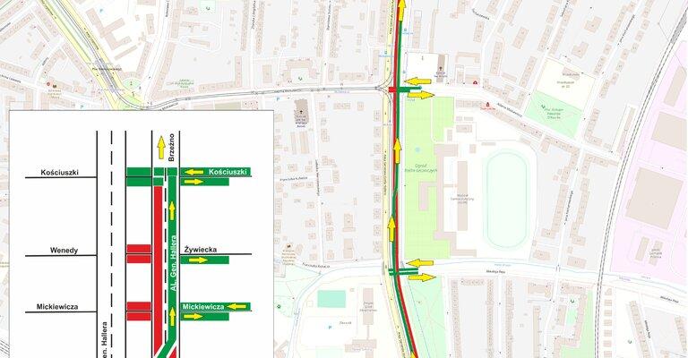 Od 21 marca od godziny 5:00 do wtorku 24 marca ulegnie zwężeniu prawy pas jezdni na odcinku od ul. Okrzei do ul Mickiewicza. Objazd wytyczono ulicą Kościuszki. Na odcinku od ul. Mickiewicza do ul. Kościuszki także w kierunku Brzeźnia zwężeniu ulegnie lewy pas ruchu. Kolejne zmiany organizacji ruchu nastąpią 24 marca.