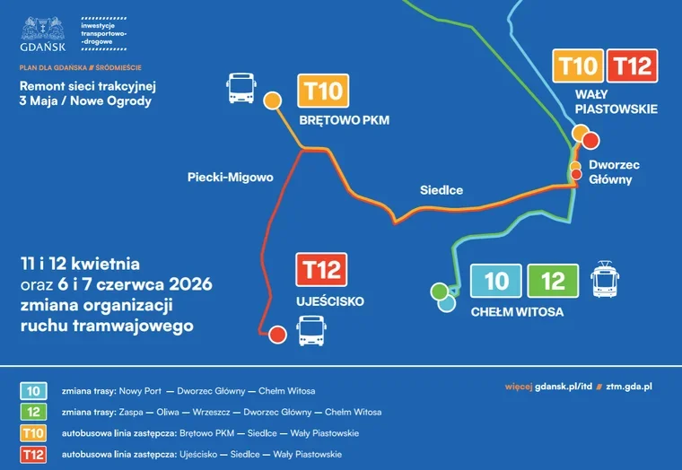 W czasie prac inaczej pojadą m.in. linie 10 i 12. Uruchomione zostaną także linie zastępcze T10 i T12, które połączą kluczowe punkty miasta, umożliwiając kontynuowanie podróży.