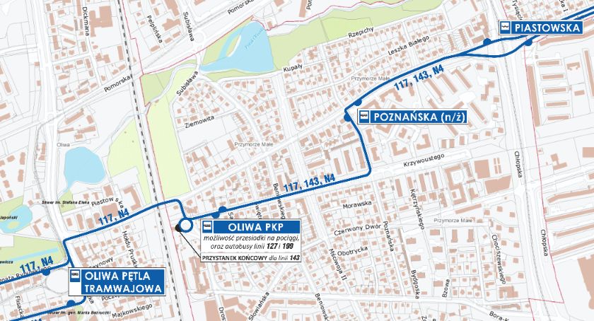 - W kierunku pętli Oliwa PKP autobusy od przystanku Piastowska do przystanku Oliwa PKP pojadą ulicami: Piastowską – Poznańską – Krzywoustego. Na zmienionym odcinku trasy zatrzymają się wyłącznie na przystanku Poznańska przy ul. Poznańskiej (przystanek przeniesiony). W kierunku przeciwnym trasa bez zmian.