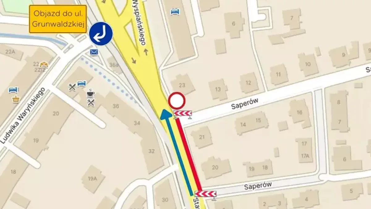 Od strony placu ks. Komorowskiego w kierunku ul. Grunwaldzkiej przejazd zostanie przeprowadzony przez ul. Ludwika Waryńskiego. Natomiast objazd z ul. Saperów oraz Franciszka Kubacza będzie prowadził przez ul. Mickiewicza.