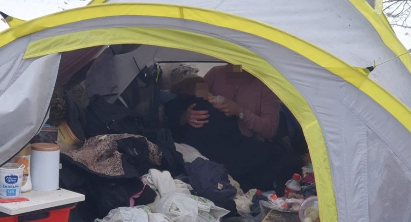 Wczoraj po południu dyżurny jednostki policji otrzymał zgłoszenie od pracownika socjalnego, że na terenie zalesionym nieopodal alei Jana Pawła II rozstawiony jest namiot, w którym prawdopodobnie przebywa dziecko, a także trzy bezdomne osoby dorosłe. Mieszkańcy nie chceli wpuścić pracownika MOPR oraz strażnika miejskiego.