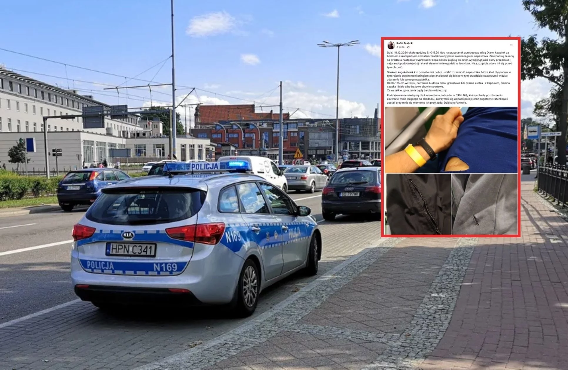 Obecnie zraniony przez agresora pan Rafał, apeluje o pomoc w ustaleniu tożsamości sprawcy. Szczególnie pomocne mogą być nagrania z prywatnych kamer czy nawet znajdowanie się w pobliżu miejsca zdarzenia. Każda nawet najmniejsza informacja może pomóc w posunięciu sprawy do przodu.Z relacji zaatakowanego pana Rafała wynika, że napastnik mógł mieć około 175 cm wzrostu i normalną budowę ciała. W chwili ataku ubrany był w granatową/czarną kurtkę z kapturem, ciemną czapkę i jasne buty sportowe.