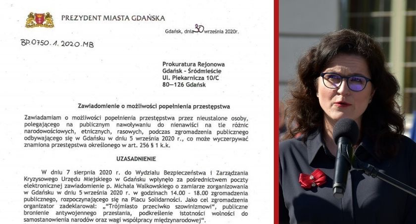 - Zawiadamiam o możliwości popełnienia przestępstwa przez nieustalone osoby, polegającego na publicznym nawoływaniu do nienawiści na tle różnic narodowościowych, etnicznych, rasowych, podczas zgromadzenia publicznego odbywającego się w Gdańsku w dniu 5 września, co może wyczerpywać znamiona przestępstwa określonego w art. 256 § 1 k.k. - pisze Aleksandra Dulkiewicz, prezydent Gdańska.