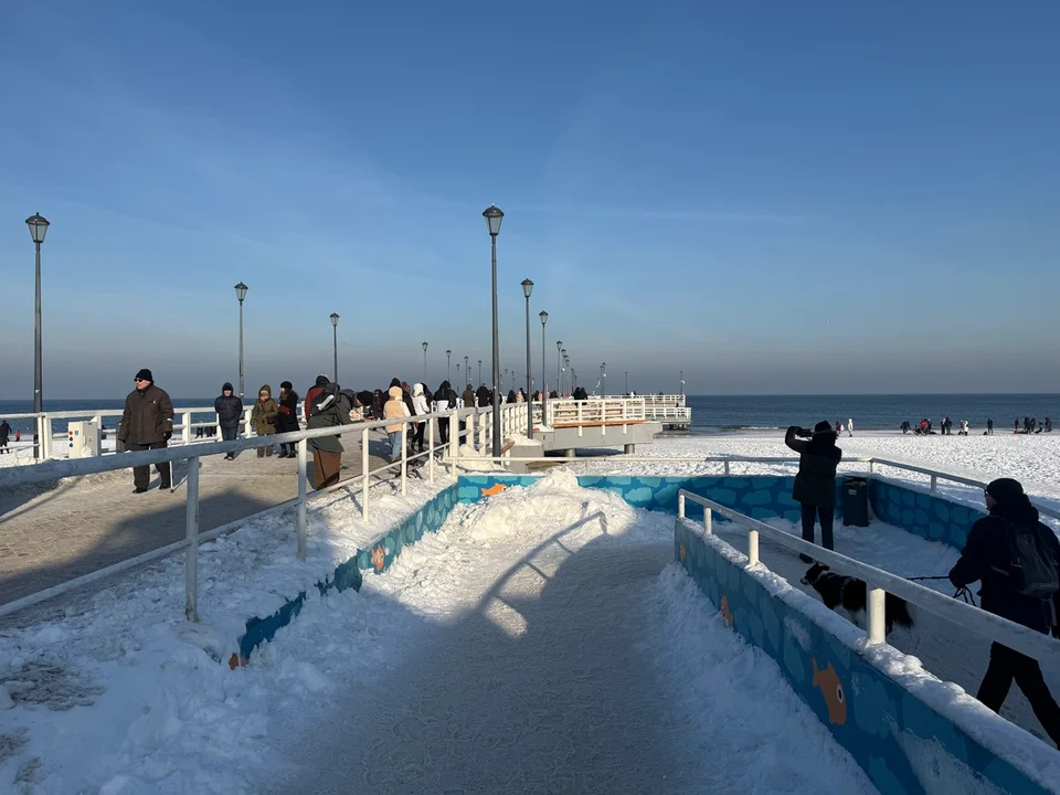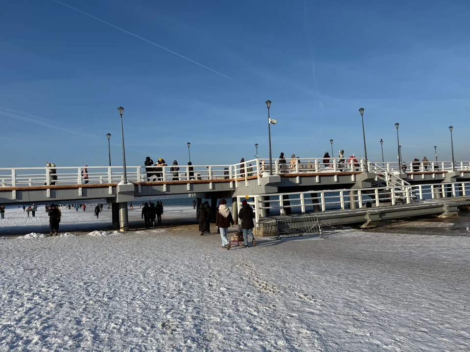 Pomimo niskiej temperatury z obiektu korzystają spacerowicze. Na molo pojawiają się zarówno mieszkańcy okolicznych dzielnic, jak i osoby odwiedzające Brzeźno. Ruch widoczny jest również na plaży, gdzie wiele osób wybiera krótkie spacery wzdłuż linii brzegowej.