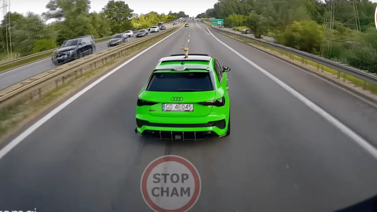 Na nagraniu widać bowiem, jak kierowca zielonego Audi próbuje na sile wcisnąć się przed inne pojazdy, łamiąc tym samym zasady obowiązujące w sytuacji zwężenia drogi. To jednak nie wszystko — po chwili z otwartego szyberdachu auta kierujący pokazuje środkowy palec w stronę pojazdu, który zarejestrował całe zajście.