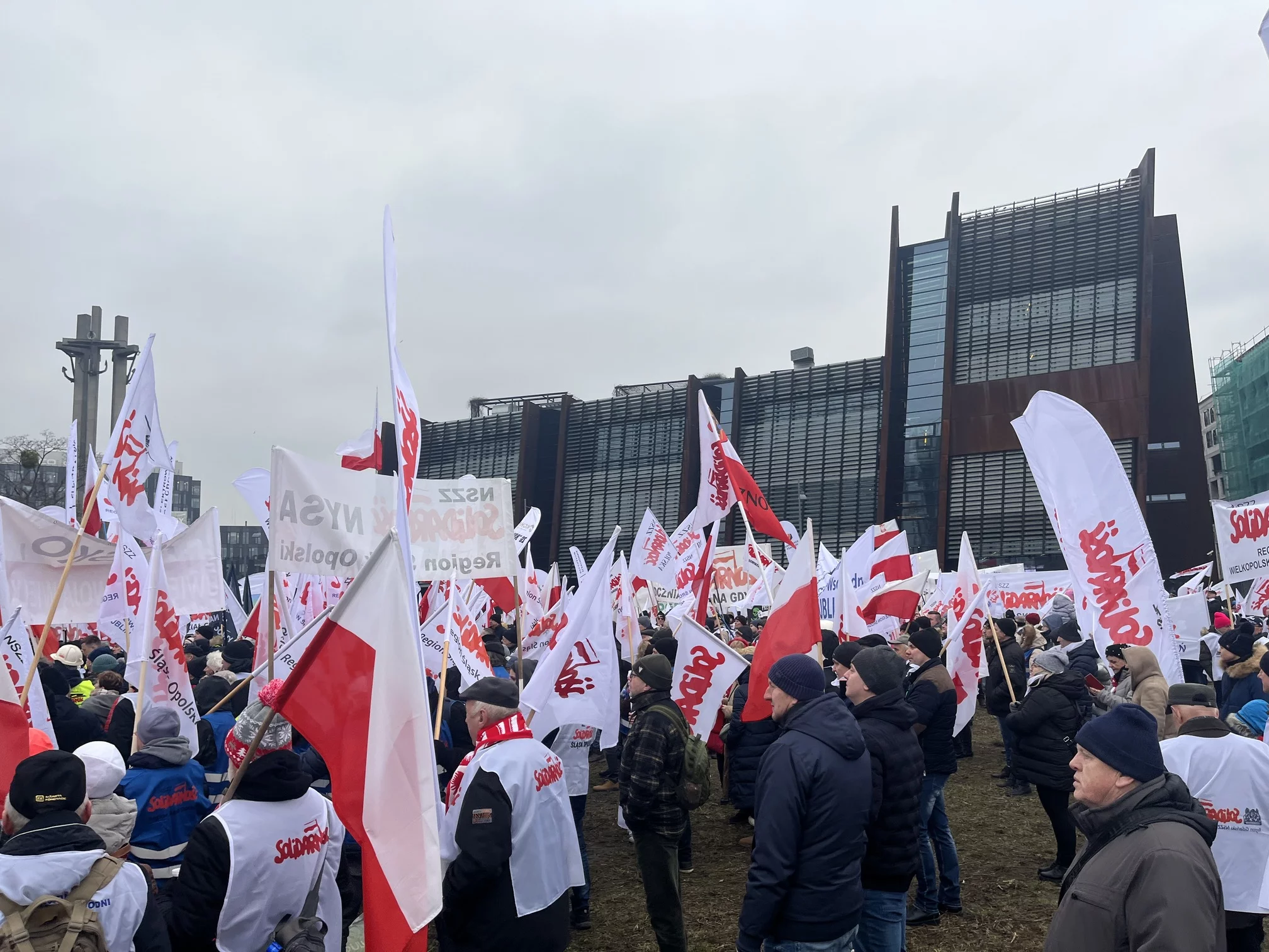 Jednak zdecydowanie bardziej widoczne było to, co działo się przed budynkiem ECS, w pobliżu historycznej Sali BHP. W związku z przyjazdem komisarzy Komisji Europejskiej związkowcy Solidarności zwołali protest, którego głównym tematem był sprzeciw wobec “Zielonego Ładu”.