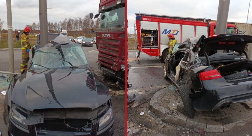 Do zdarzenia doszło w czwartek po godzinie 8.00 na skrzyżowaniu w ciągu ulicy Kontenerowej (Stogi). Samochód ciężarowy uderzył w pojazd osobowy, a następnie wepchnął go na słup sygnalizatora.