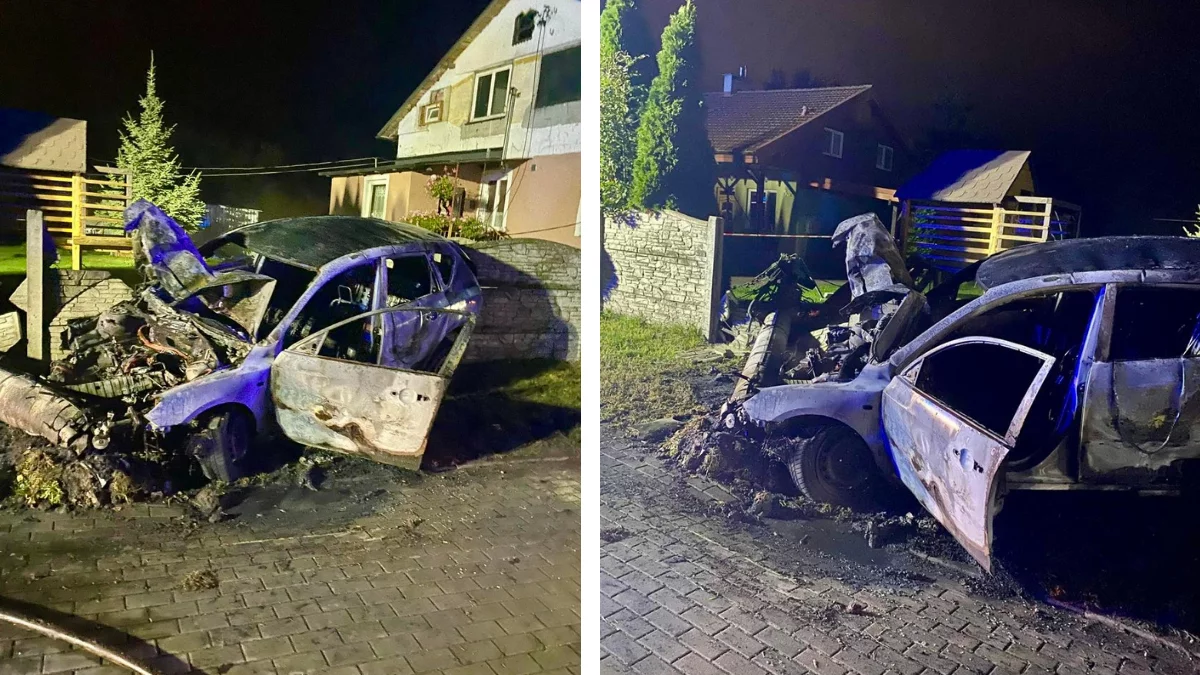 Gdy ratownicy przyjechali na miejsce, zastali pojazd całkowicie objęty ogniem. Na dachu auta leżał przewrócony słup energetyczny. Widok był na tyle groźny, że przez chwilę mogło się wydawać, iż doszło do tragedii.